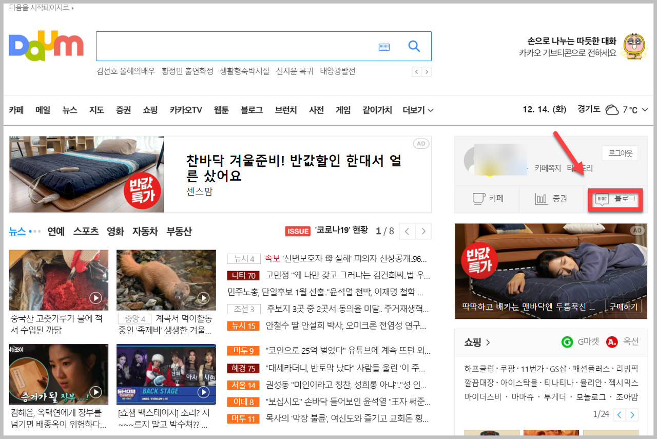 내 블로그 가기 위해서는 일단 다음에 들어가서 로그인을 먼저 하셔야 합니다. 로그인하면 아래와 같은 화면이 나오게 됩니다.