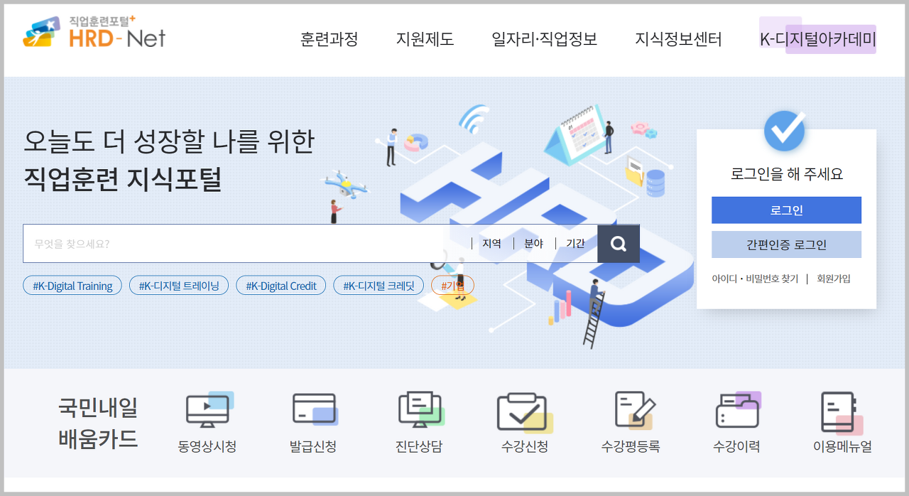 취업준비생부터 구직자, 재직자분들이 많이 활용하는 사이트 중 하나가 고용노동부 하드넷 입니다. 이 사이트는 직업훈련을 위해 수강비를 지원을 받을 수 있는 국민 내일배움카드를 발급할 수 있을 뿐만 아니라, 국비 지원이 가능한 학원을 알아볼 수 있고, 그 외에도 직업과 관련한 여러 가지 정보를 얻을 수 있습니다