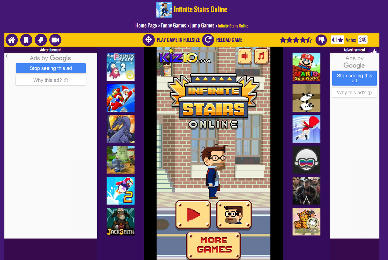 위 링크를 클릭하시면 무한의 계단을 웹에서 게임을 할 수 있는 페이지로 들어가실 수 있습니다. 얘네도 먹고살아야 하기 때문에 광고가 있는데 좀 많습니다.