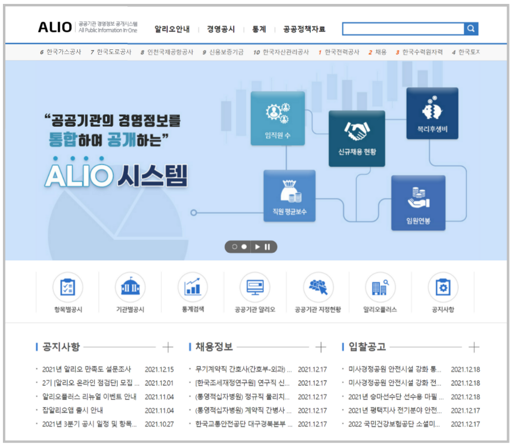 공공기관 알리오 홈페이지에 들어가시면 아래와 같은 화면을 볼 수 있습니다.