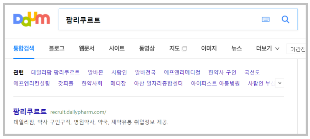 위 화면은 다음에서 간단하게 '팜리쿠르트'라고 검색어를 입력을 했을때의 검색 결과 입니다. 이러한 검색 결과는 다른 대형 포털사이트에서도 비슷하게 나오게 됩니다.