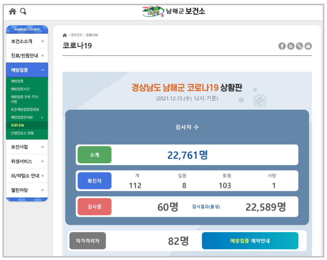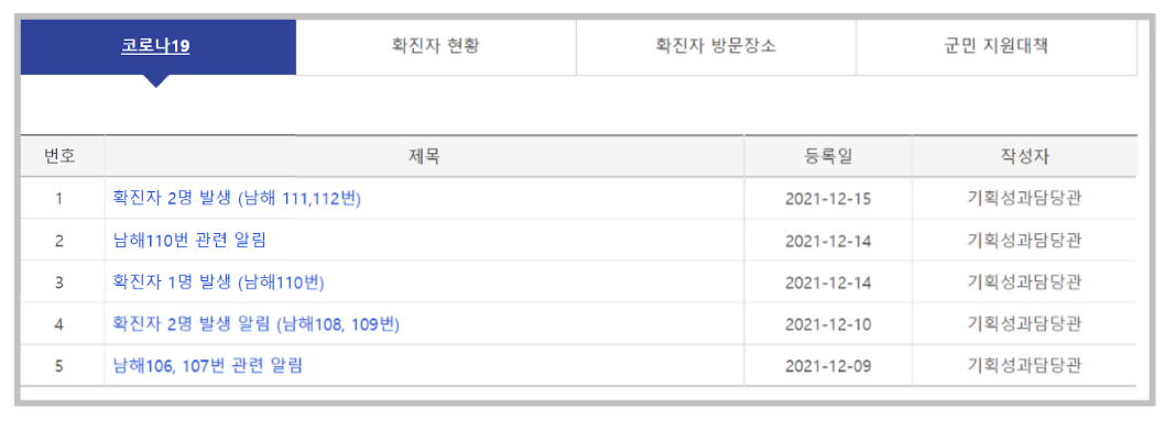 지자체 홈페이지에서 취급하고 있는 가장 중요한 정보는 현재 사는 지역의 코로나 확진자 숫자입니다. 그리고 그 확진자가 어디에서 발생했는지 알 수 있습니다. 남해군에 거주하시는 분은 남해군청 홈페이지에 들어가시면 이러한 정보를 쉽게 얻을 수 있습니다.