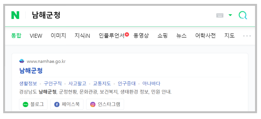 네이버에서도 '남해군청'이라고 검색을 하면 해당 사이트가 첫 번째 검색 결과로 나옵니다. 네이버의 검색 결과에서 특이한 점을 이야기하지만 블로그와 페이스북 검색 결과도 쉽게 볼 수 있다는 것입니다.