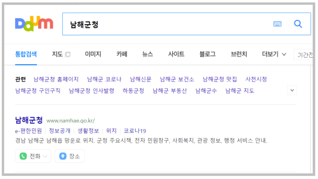다음에서 간단하게 남해군청이라고 검색을 하면 첫 번째 검색 결과로 나오고 있습니다.